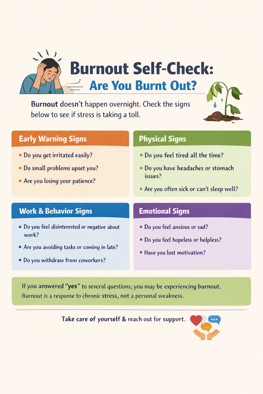 The signs of burnout are often subtle at first, and many people do not associate them with workplace stress. One of the earliest indicators is irritability, frustration, and reduced tolerance [2].