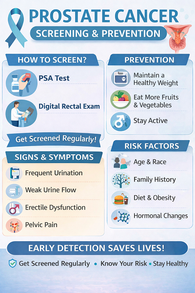 Prostate cancer is the second most common cancer among males. Prostate cancer risk factors include advanced age, family history, lifestyle, and diet. Screening methods allow for early detection of problems, leading to effective management and improved quality of life. By promoting smoking cessation, regular exercise, and maintaining a healthy weight. Lifestyle changes can reduce the chance of getting cancer and improve survival rates for prostate cancer patients. Screening methods allow for early detection of problems, leading to improved quality of life and effective management. Always consult a doctor for expert advice and diagnosis of a condition.